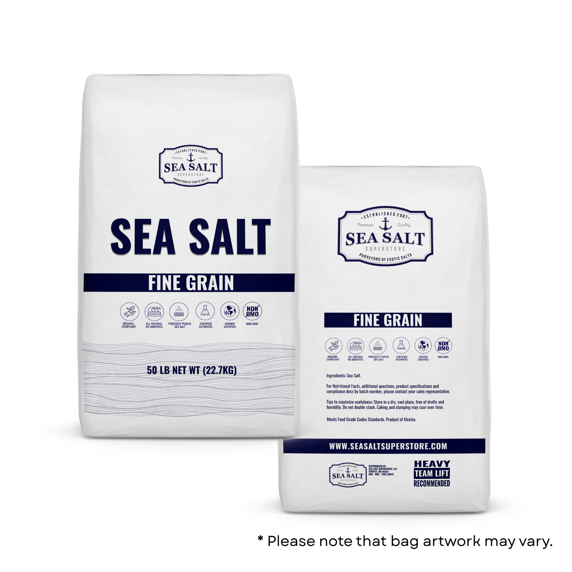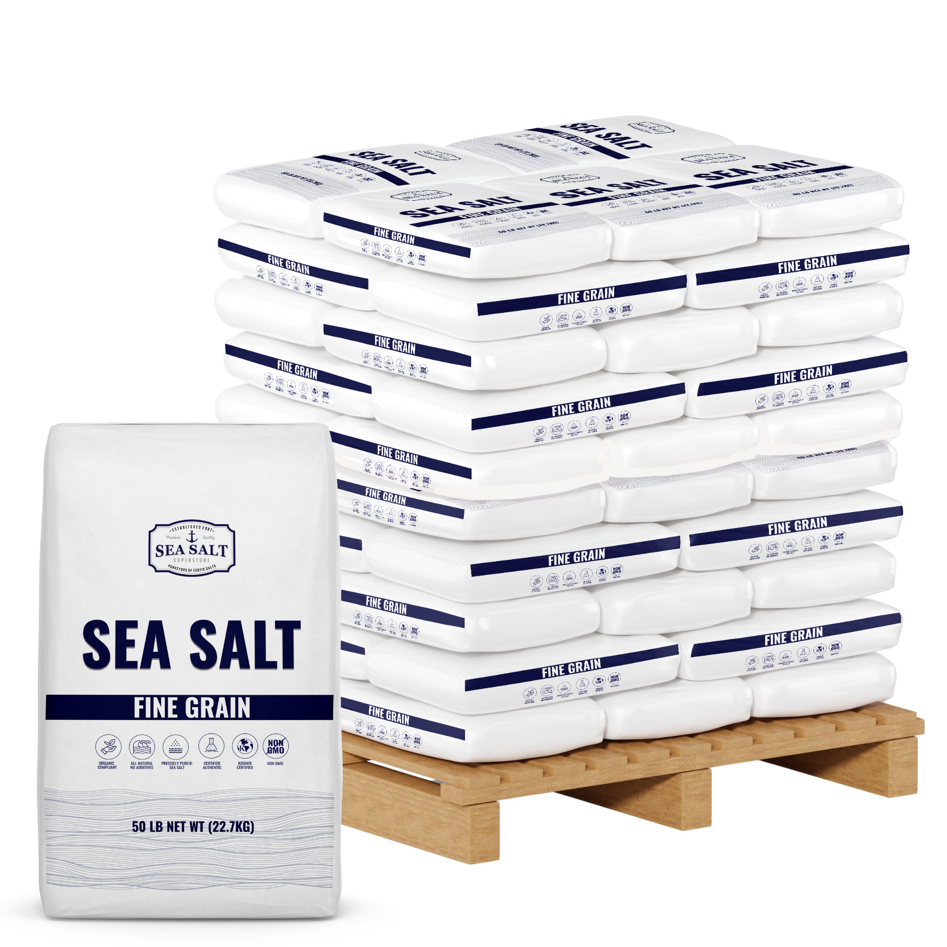 Our Fine Grain Sea Salt is a premium, all-natural sea salt sourced from the pristine waters of the Pacific Ocean. This bulk pallet includes 50 lb bags, totaling 2,500 lbs, making it ideal for food processing, seasoning blends, and large-scale commercial use.