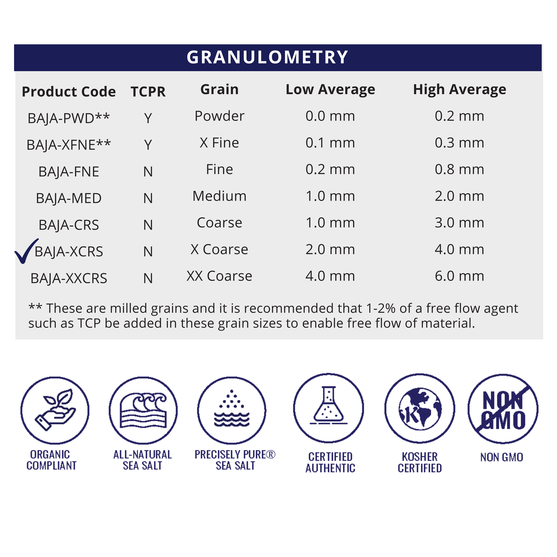 Our Baja X-Coarse Grain Sea Salt is a high-quality, all-natural salt harvested from the pristine waters of the Baja coastline. This salt contains no additives and is kosher, non-gmo and organic compliant. This 50 lb bag pallet (2,500 lbs total) is perfect for bulk buyers, food manufacturers, and businesses that require extra-large salt crystals for various applications.